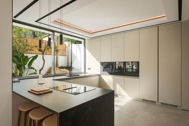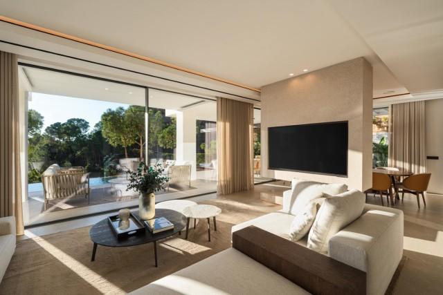 The interiors, designed with a harmonious palette of natural tones and premium materials, create a sophisticated yet relaxing atmosphere. Exclusive bespoke furniture enhances each space, providing a cohesive look defined by quality craftsmanship and subtle detailing. The main living area is an impressive open space with oversized sliding panels that fully retract, creating a seamless extension to the terrace. The combination of integrated lighting, refined textures and carefully curated furnishings results in a living environment that is both visually striking and highly functional.