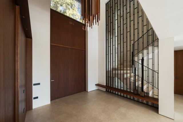 The kitchen and dining spaces maintain the same level of design excellence, featuring high-end appliances, generous work surfaces, and elegant custom cabinetry. The open layout encourages interaction and offers uninterrupted views toward the terrace, making this floor ideal for daily life as well as entertaining. Floor-to-ceiling windows frame the landscaped exteriors and enhance the sense of openness and connection to the surroundings.