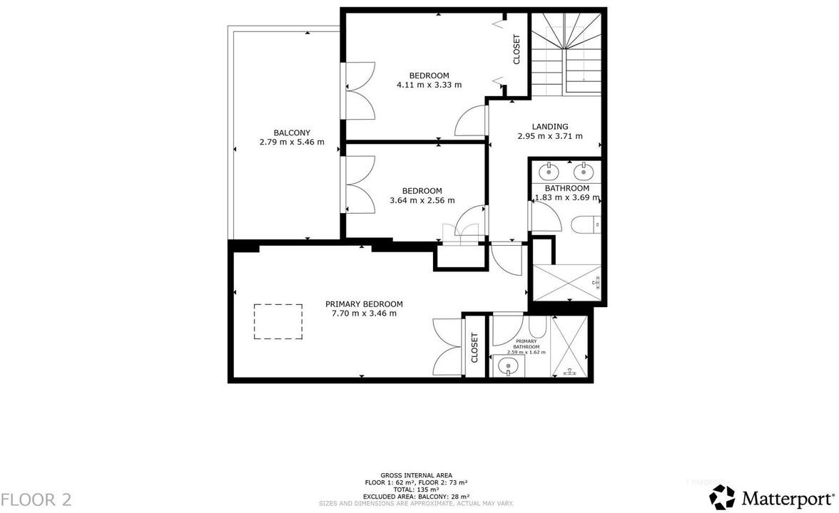 Upstairs: Three bedrooms + 2 bathrooms as follows:
