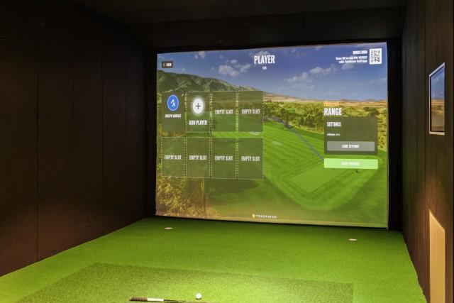 The lower level further enhances the home’s appeal with its versatile entertainment area, currently arranged as a private golf simulator, along with a secure garage for three vehicles and additional storage space.