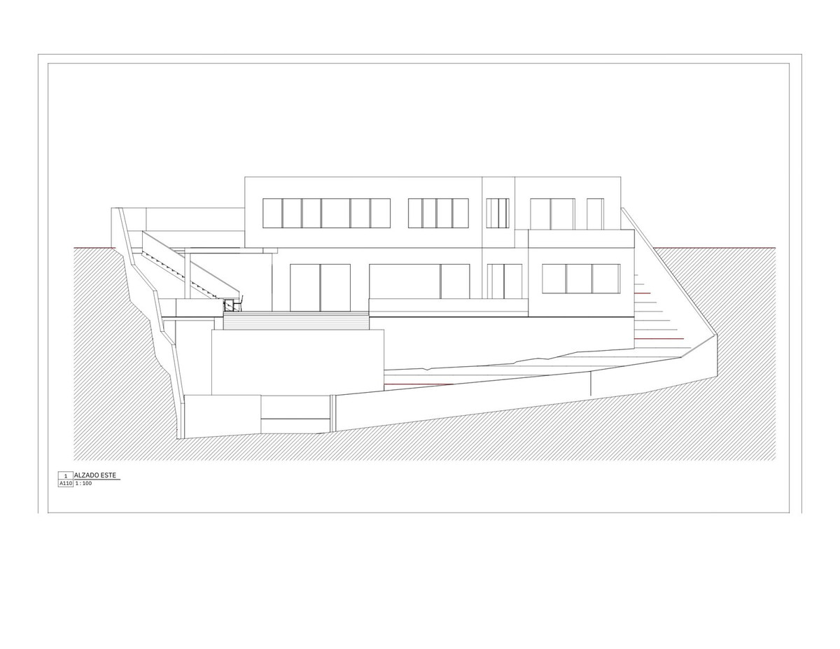 The projected dwelling is modern and functional, with two levels arranged around a side patio that provides illumination and ventilation.
