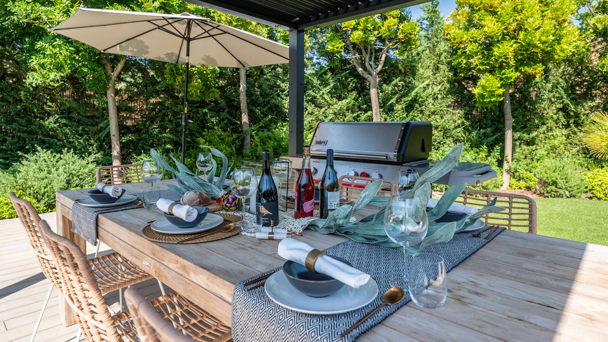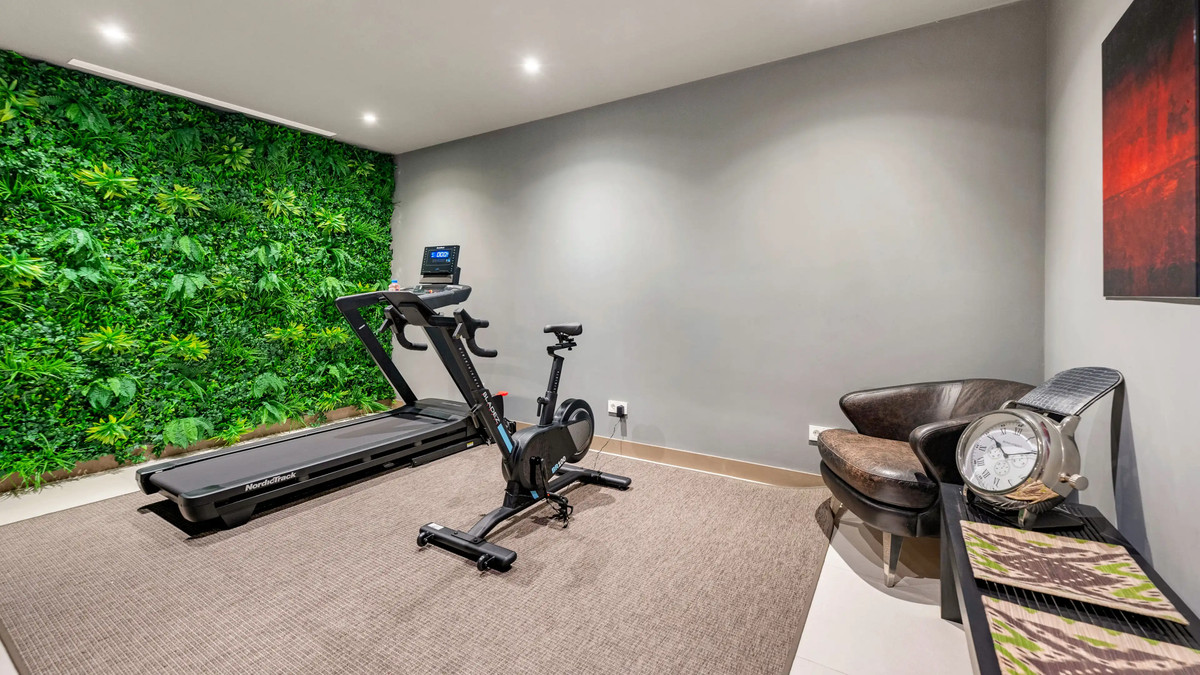The upper level holds the calm bedroom suites, each with a king bed and direct terrace access. Outside, you find a private pool, manicured lawns and a shaded dining area with a BBQ. The lower level has a cinema room, a second lounge, a bar area, a workspace and a small wellness zone for yoga or light training.