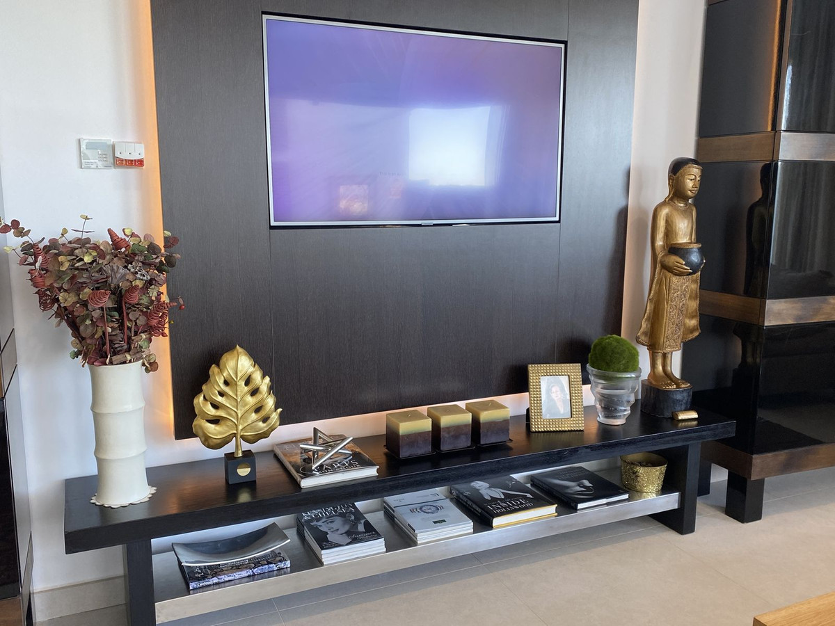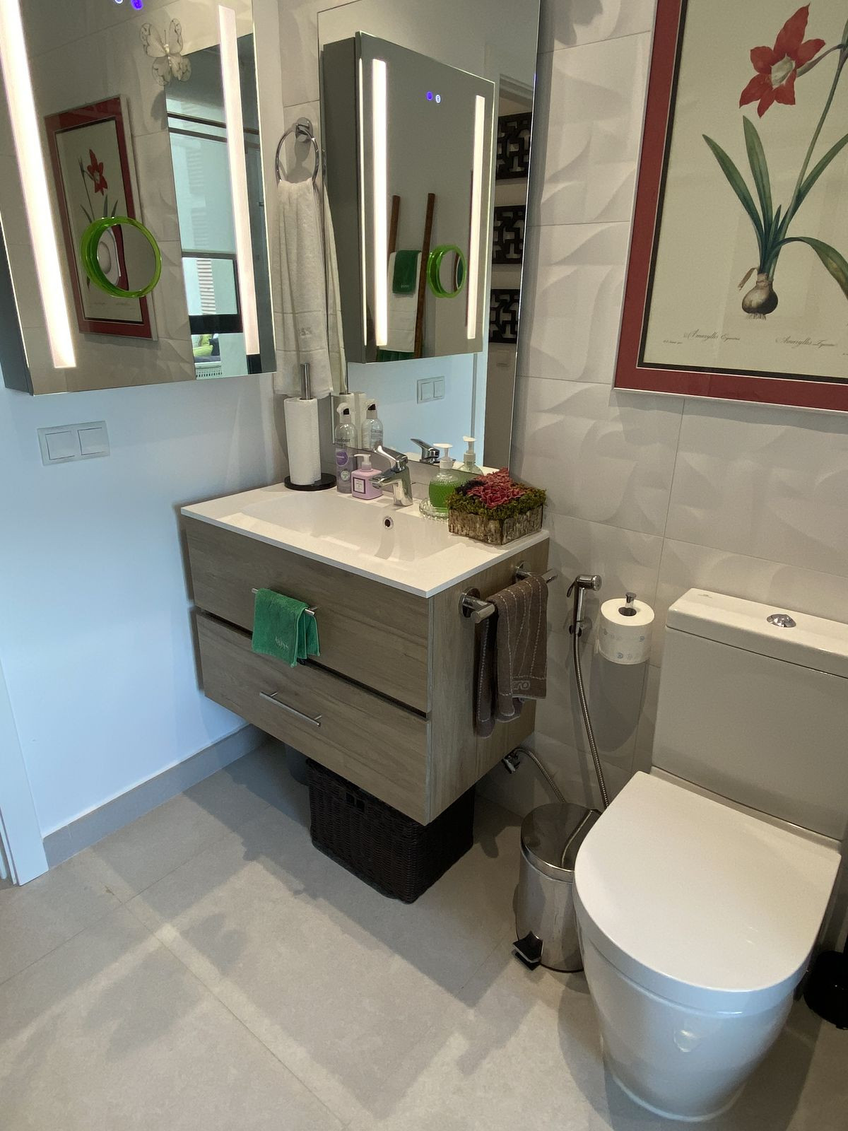 The master suite includes a walk-in closet and private terrace, complemented by two additional bedrooms ideal for guests or family. Marble floors, premium carpentry, and full climate control ensure comfort and elegance throughout.