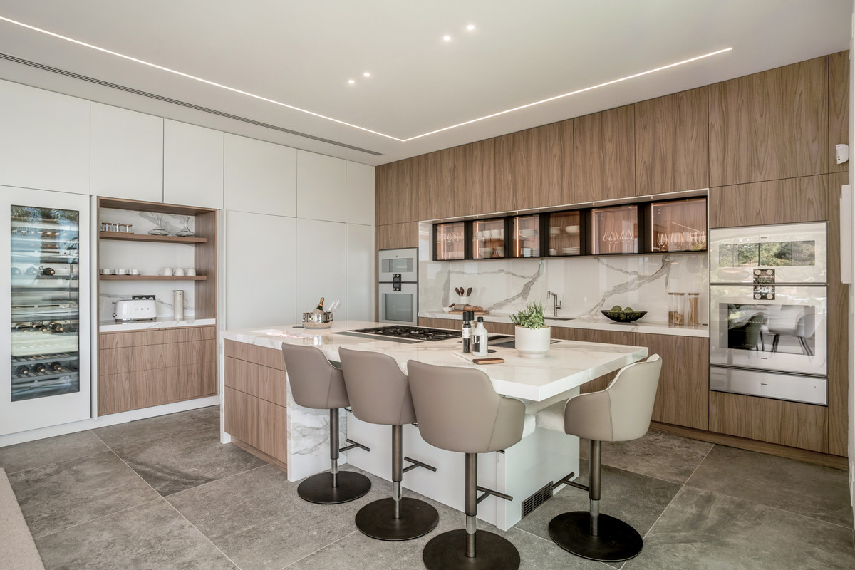 The kitchen features high-quality Gaggenau appliances and sleek cabinetry from Danespan, combining modern design with everyday functionality. An adjacent home office offers a quiet space for work or study.