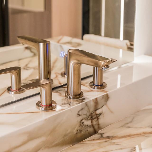 The apartment offers three well-proportioned bedrooms and two modern bathrooms, all finished with underfloor heating and high-quality fittings. The principal suite features a spacious walk-in wardrobe and a beautifully designed en-suite bathroom with Japanese toilet technology, reflecting the attention to detail seen throughout the home.