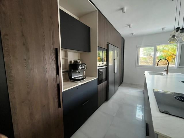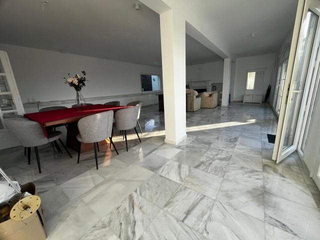 The villa features a bright and well-planned layout with five bedrooms, three of them en suite, five bathrooms, and an independent studio apartment, ideal for guests or staff accommodation. Interior spaces include marble floors, a fireplace, a games room, a laundry room, and pre-installation for air conditioning.