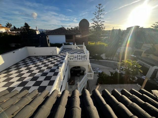 Outdoors, the property boasts a lush private garden with a private swimming pool, barbecue area, and solarium, offering pleasant views of the garden, pool, mountains, and partial sea views. A private garage and excellent road access complete this property, which is ideally located close to schools, shops, restaurants, golf courses, and public transport. An ideal family home or investment opportunity on the Costa del Sol.