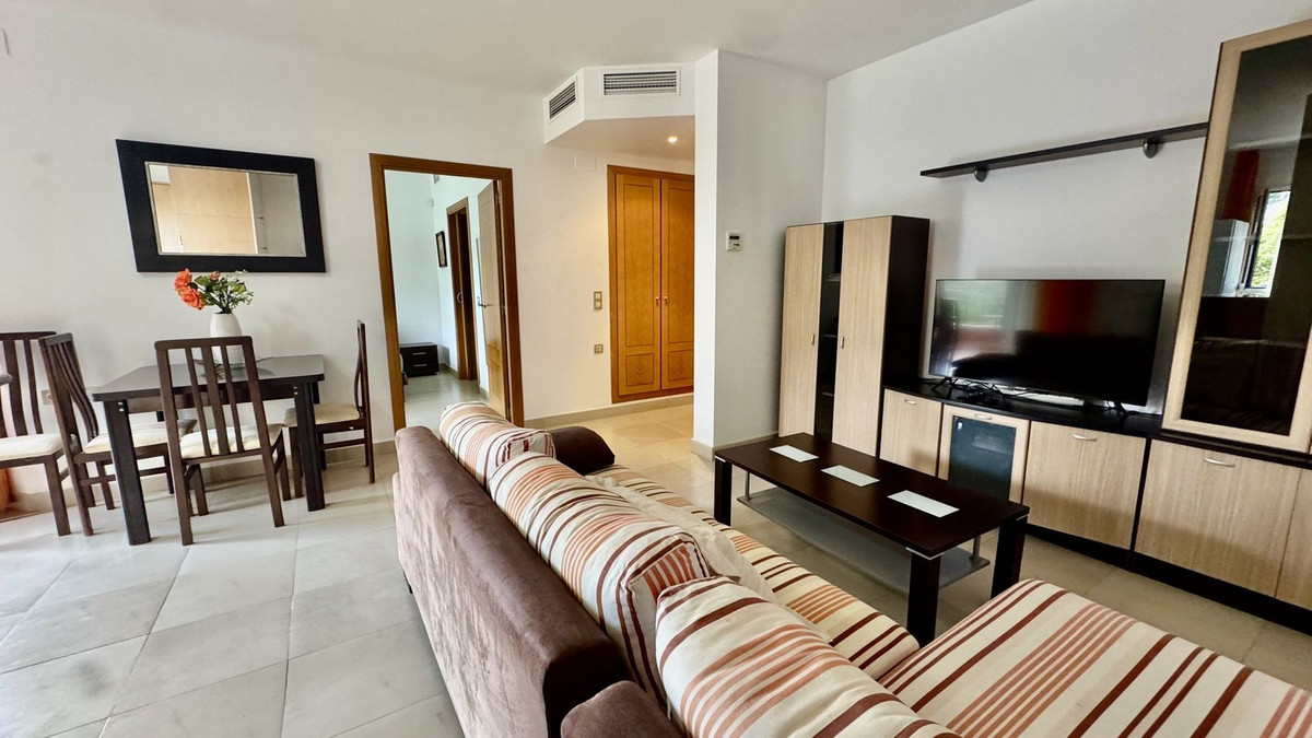 A bright, one-bedroom, one-bathroom apartment is for sale in the Sensara urbanisation in Benalmádena. Sensara is located midway between Arroyo de la Miel and Benalmádena Pueblo. The apartment offers beautiful views of the communal garden, golf course, mountains, and sea. It faces east.