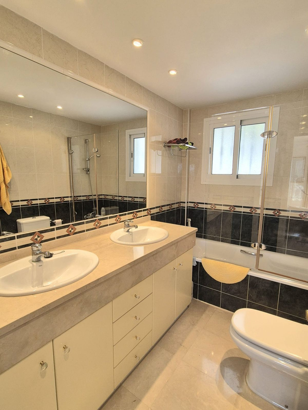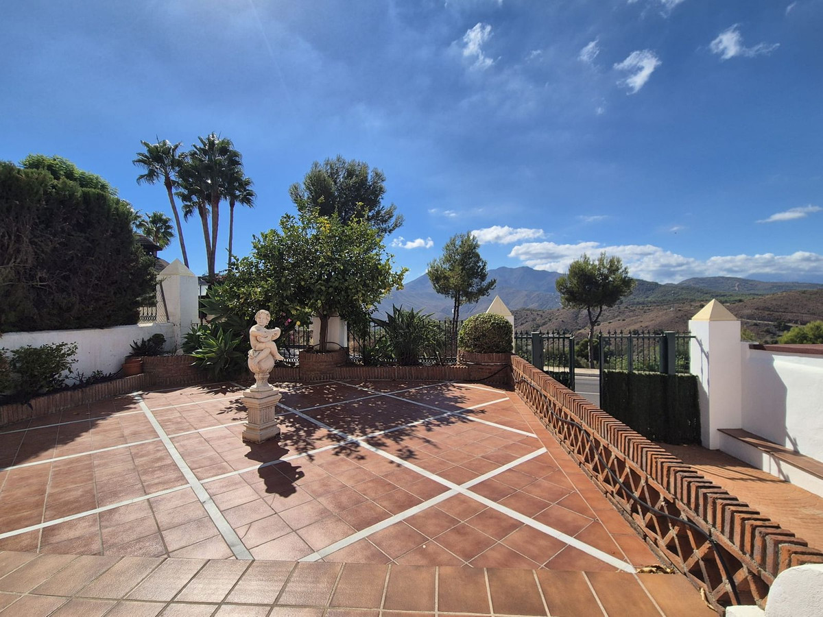 You enter the property via the private front gate, where you have your own parking space. You go up a few stairs to the main level where the property and terraces are. You have a large front terrace that is easy maintenance with flowerbeds that have automatic irrigation in place, a covered terrace with nice seating area and amazing views of the golf course, mountains and the sunset. The property is set over two floors, as you enter to the left you have a full bathroom, stairs that go up to the 2nd level and a under the stairs storage room. In front of you is a large fully equipped kitchen with a door that accesses the back terrace. From the hallway to the right you have the large living / dining room with air conditioning and two patio sliding doors that lead out to the front of the terrace. Upstairs straight in front of you, is the master bedroom with fitted wardrobes, private terrace and en suite full bathroom. To the left of the hallway you have the other 2 double bedrooms with fitted wardrobes and a bathroom to share. The house has 2 split centralizad air conditioning.