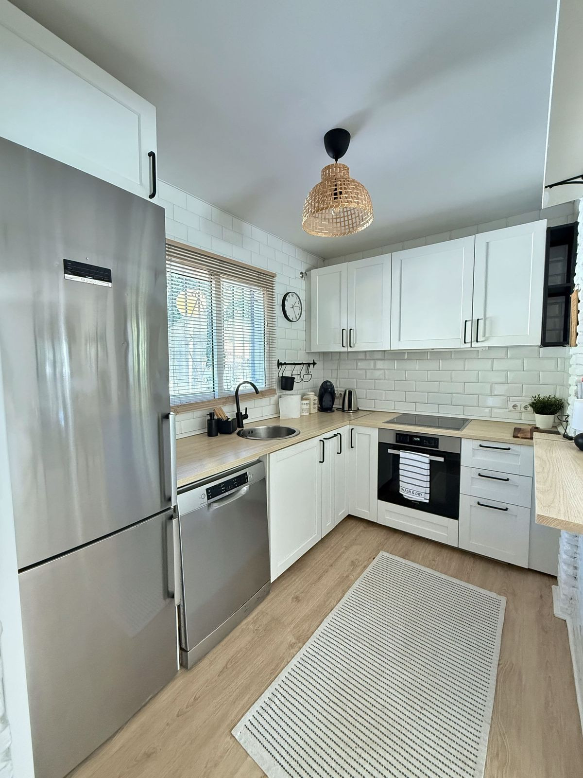The fully equipped fitted kitchen with breakfast bar connects seamlessly with a spacious and bright living-dining room, offering direct access to the private terrace and garden.