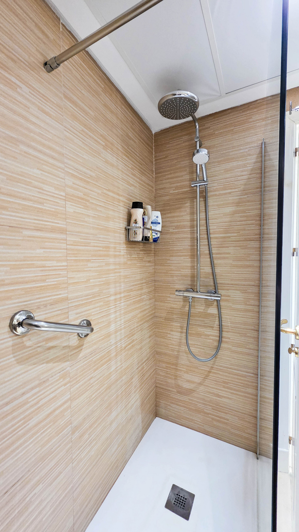 The apartment features three bedrooms and two bathrooms, including a refurbished kitchen and updated bathroom finishes that add a modern touch to the interior. The living and dining area opens directly onto a large private terrace, where sea views form a natural backdrop to daily life. A central section of the terrace has been enclosed with glass curtains, creating a bright extension of the living room that can be enjoyed in all seasons while still allowing flexibility to open the space fully.