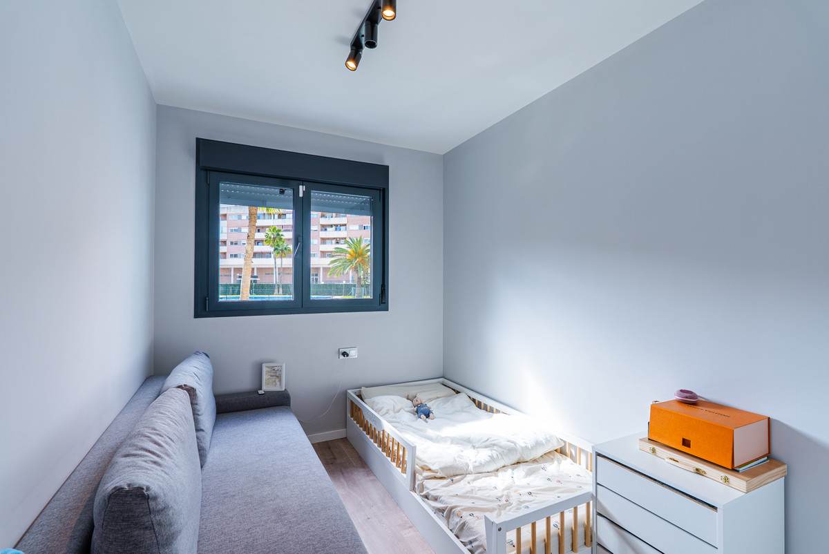 With 115 m² of built space, the apartment features a spacious open-plan living and dining area, a fully fitted contemporary kitchen, and direct access to a private terrace overlooking the communal pool — ideal for morning coffee or relaxed evenings.