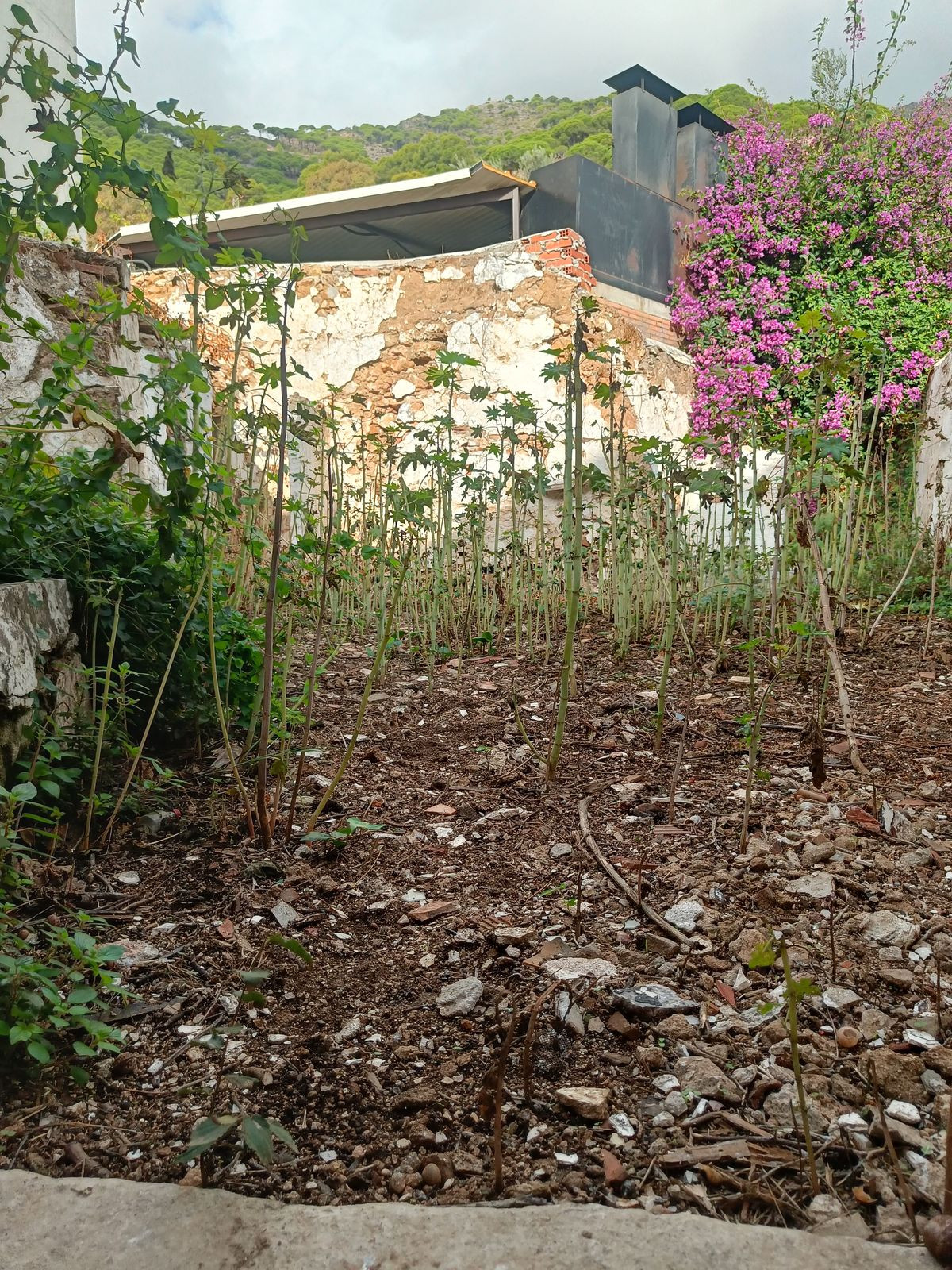 The ground floor features a spacious entrance hall, a bedroom, and the former kitchen area. From here, you can access a patio with an outdoor bathroom and a secondary entrance leading to a small private garden, perfect for enjoying the Mediterranean climate.