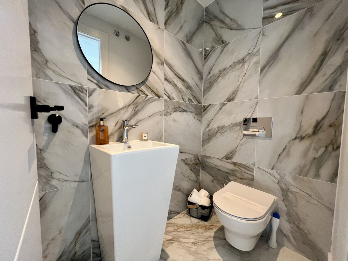 The upper floor comprises the master bedroom with built-in wardrobes and en-suite bathroom, as well as a second bedroom, also with fitted wardrobes and its own en-suite bathroom. From this level there is access to a spacious roof terrace with open panoramic views.