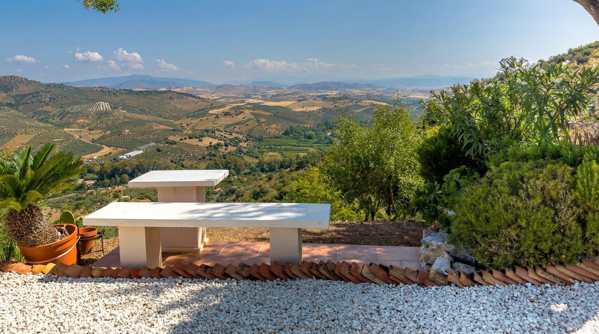 The terrace with the generous swimming pool is enchanting, offering views of the Sierra de las Nieves and the surrounding valleys. There is plenty of space around the pool for seating and sunbeds. Here you will also find the spacious sauna, an outdoor shower, and a toilet. A set of stairs leads to a private "hide-away" with a lounge chair—the perfect spot to enjoy the sunset with a glass of wine.
