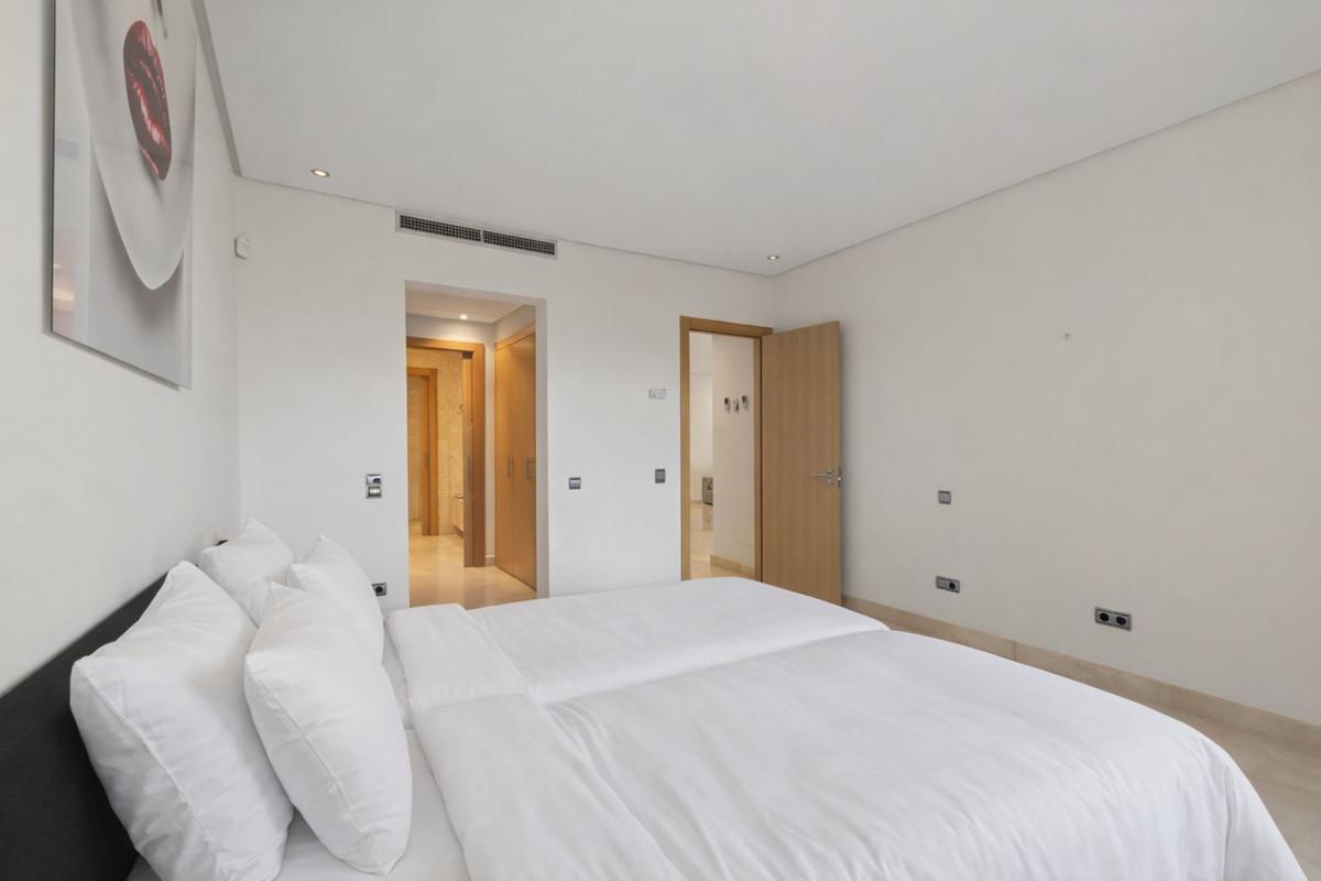 The master bedroom has direct access to the terrace and includes an en-suite bathroom with both a bathtub and a separate shower, along with a dressing area offering good storage space. The second bedroom is also well sized, benefits from natural light through large windows, and is served by a second bathroom finished to a similar standard.