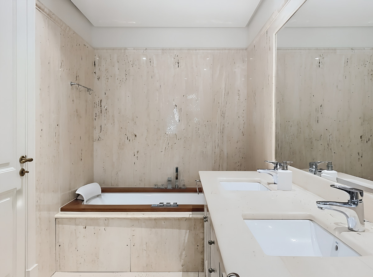 The interior stands out for its high-quality finishes and meticulous construction: acoustic insulation between units, electric shutters, REAL BIANCO cream marble floors, air conditioning, KONNEX home automation system, electric underfloor heating, and large windows that maximize natural light and views. The entire space exudes a sense of timeless elegance and well-being.