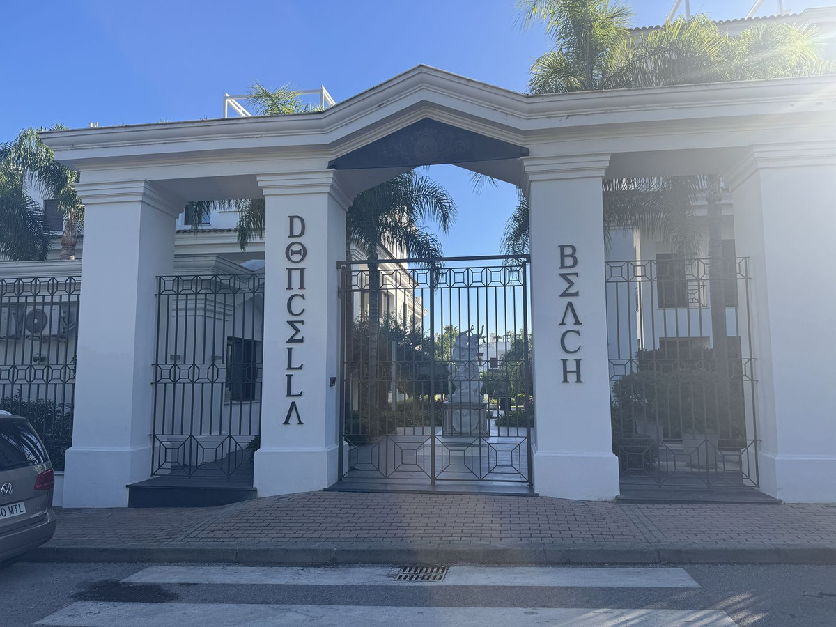 An elegant 2-bedroom, 2-bathroom apartment for sale in the prestigious beachfront development of Doncella Beach, ideally located on the first line of the sea in Estepona.