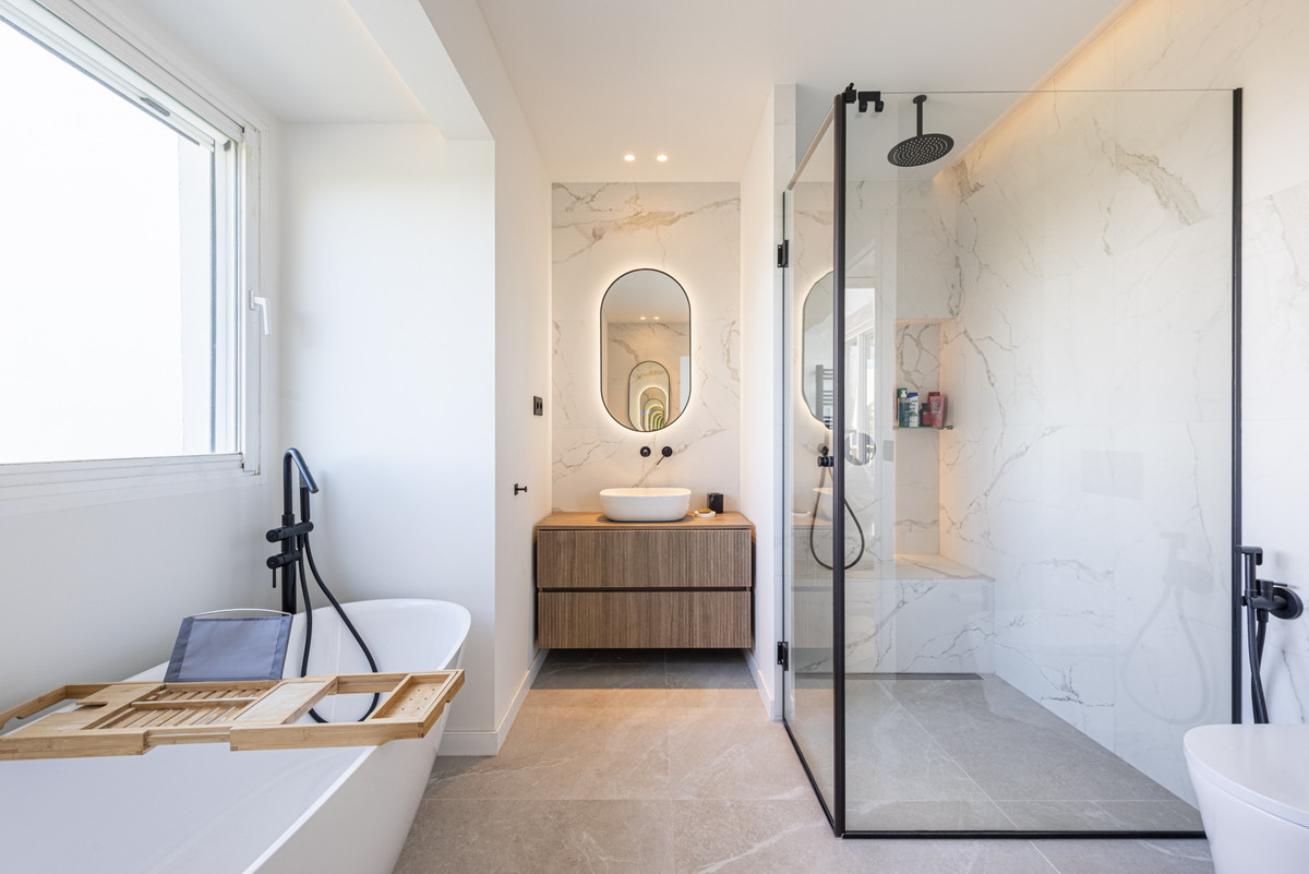 En-suite bathroom with sea views