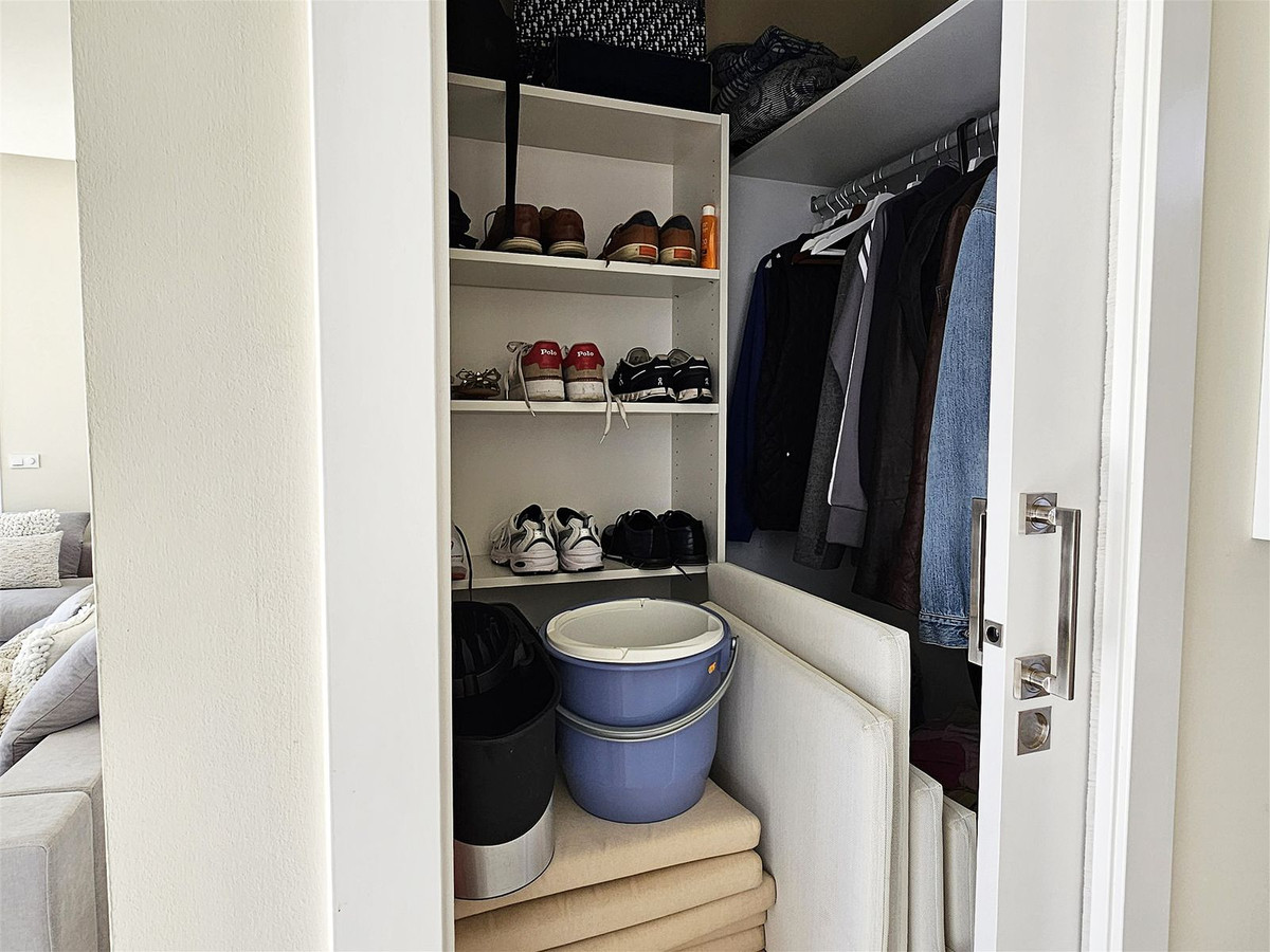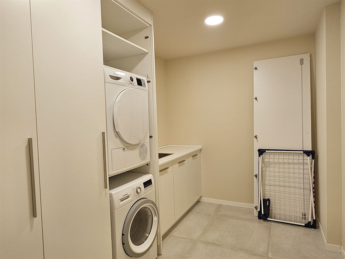 The lower basement level adds exceptional versatility, offering another spacious and bright double bedroom with fitted wardrobes, a separate large bathroom with walk-in shower, an expansive closet / storage area, laundry room, machine room, gym space, and a double garage with room for two vehicles.