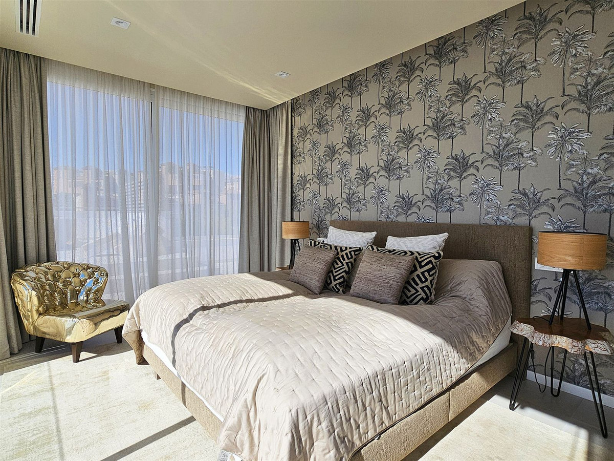 With 357m² of build arranged over three levels, all connected by both LIFT and staircase, the south-facing design makes the most of natural light throughout the day. Upon entering the property is a spacious open-plan lounge and fully equipped modern kitchen with island/breakfast bar, both with sea views and overlooking the generous 114m2 outdoor terrace and private 8 x 4m heated private swimming pool. Also on this level are two bright and generously sized bedrooms with ensuite bathrooms and fitted wardrobes, a guest toilet, and useful storage closet.