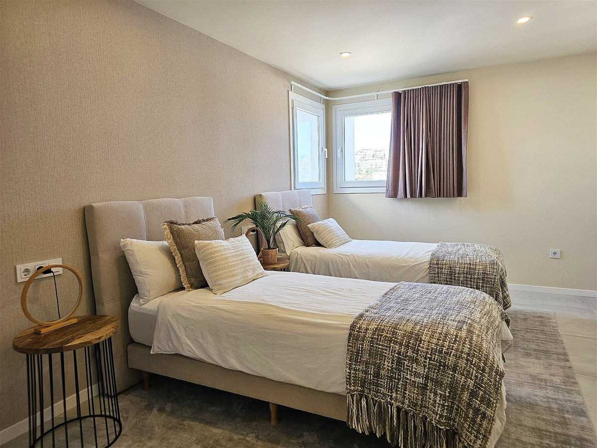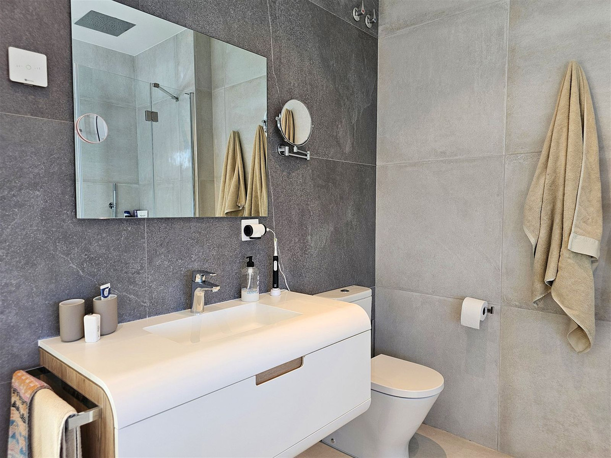 Upstairs, on the first floor, the landing is currently set up as a home office and leads out to a large 41 m2 terrace. Two further en-suite bedrooms are located on this floor, including the master suite, which enjoys particularly striking sea and golf views, a walk-in closet, and direct access to the terrace. The master bathroom features both a bathtub and separate shower.