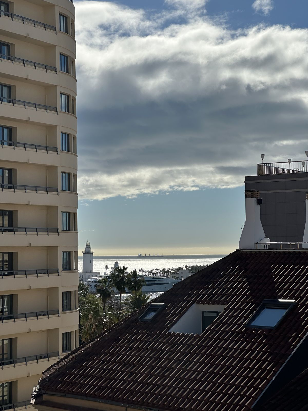 On the upper level, a second terrace is situated on the same floor as the third bedroom. From this level, an elegant spiral staircase leads to the rooftop terrace. From this elevated position, you enjoy open views towards Málaga Cathedral, partial views of the port and the sea, as well as panoramic views over the rooftops of the historic centre and the surrounding hills.
