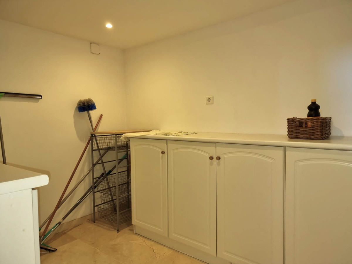 Set on an 889 m² plot surrounded by lush gardens and mature trees, the outdoor spaces are just as impressive. A large heated saltwater pool becomes your private oasis, framed by sun loungers and beautifully landscaped greenery. A shaded lounge area provides the perfect setting for entertaining or relaxing under the Mediterranean sun.