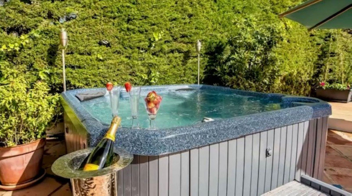 The upper floor features a bright open-plan living and dining area, a modern kitchen, and access to a covered terrace that can be enjoyed year-round. This level also hosts three spacious en-suite bedrooms, all designed to offer privacy and comfort. From here, you can enjoy views over the swimming pool.