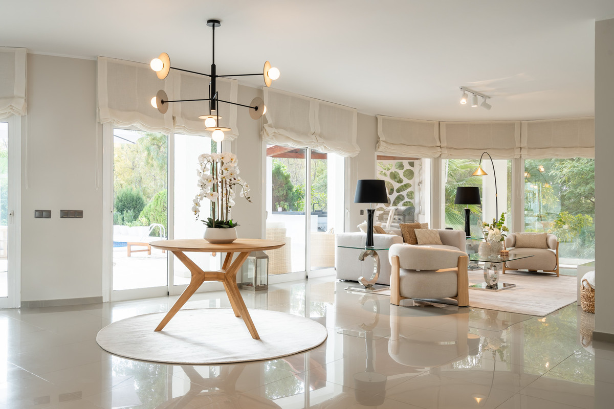 The villa features generous open-plan living areas flooded with natural light, and seamless transitions to the impressive outdoor spaces. A private swimming pool, manicured garden, and multiple terraces create the perfect environment for enjoying the Costa del Sol climate and panoramic views.