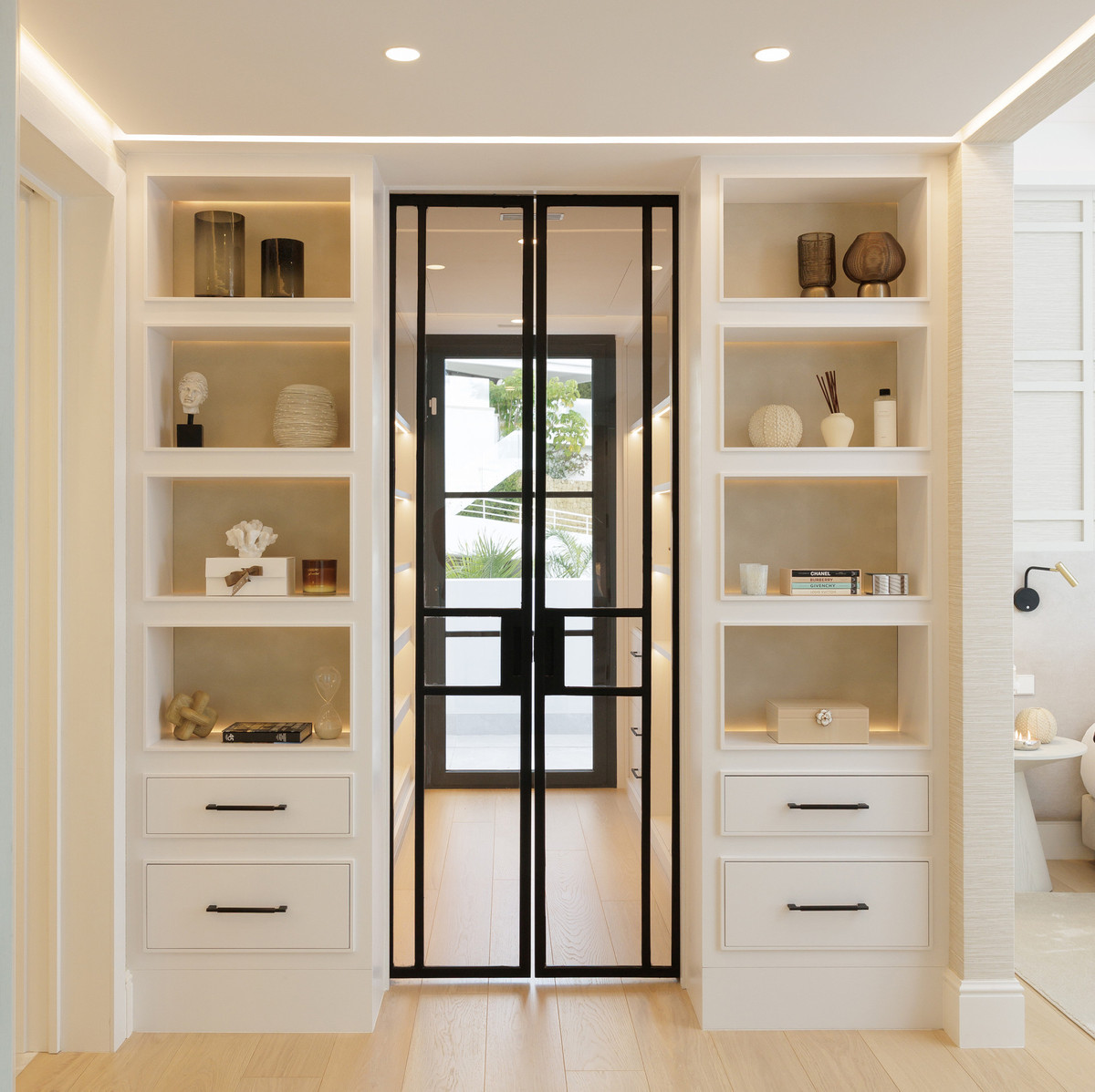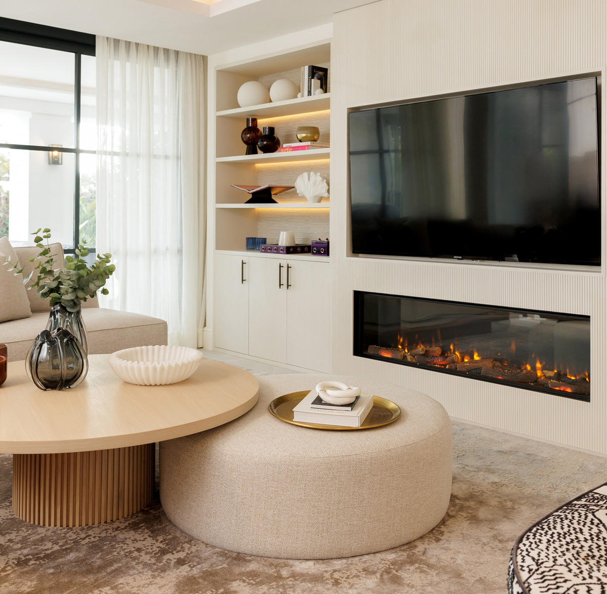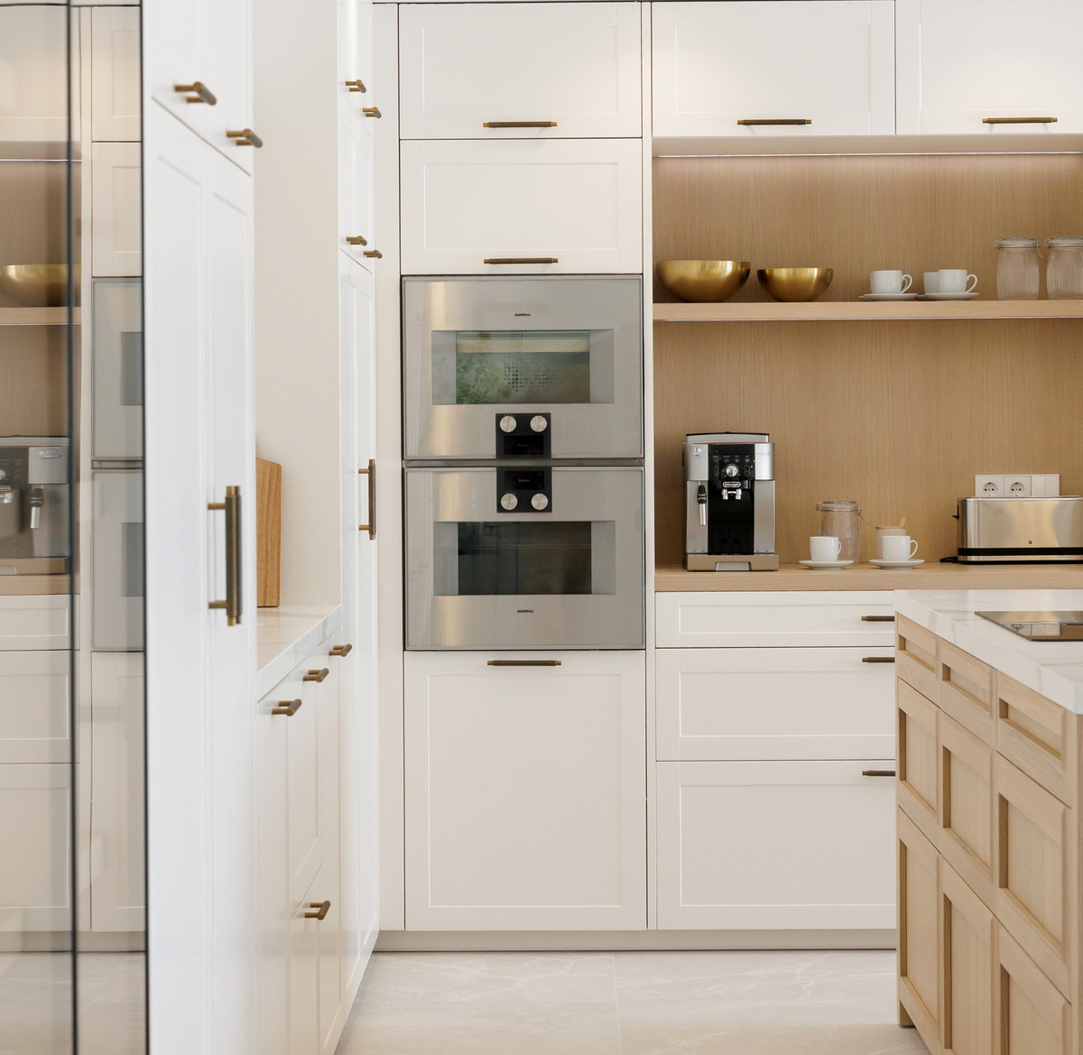 The kitchen is a key highlight of the property. Designed with clean lines and premium materials, it includes a large central island, built-in appliances, and abundant storage concealed within tailored cabinetry. The layout encourages interaction, with direct views toward the living room and seamless access to the exterior terraces and pool. This combination of layout and design makes the main floor one of the home’s strongest assets.