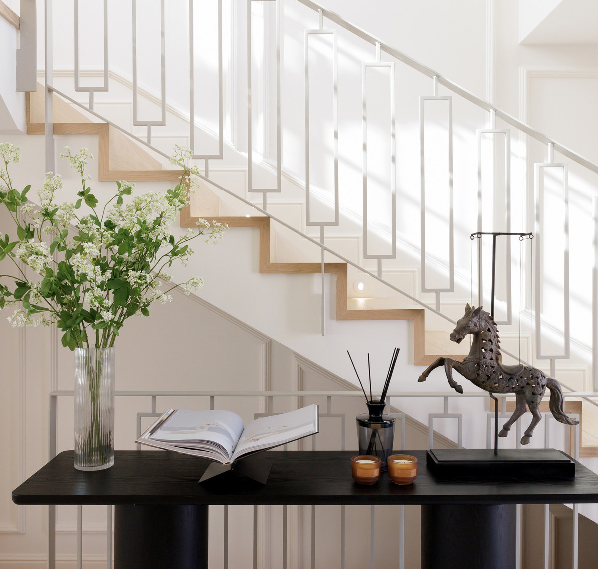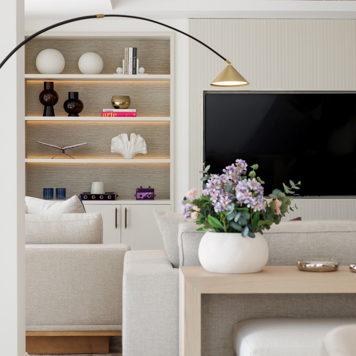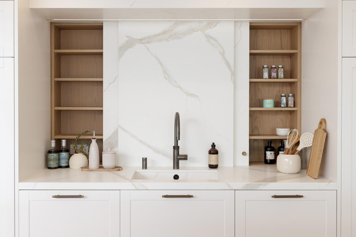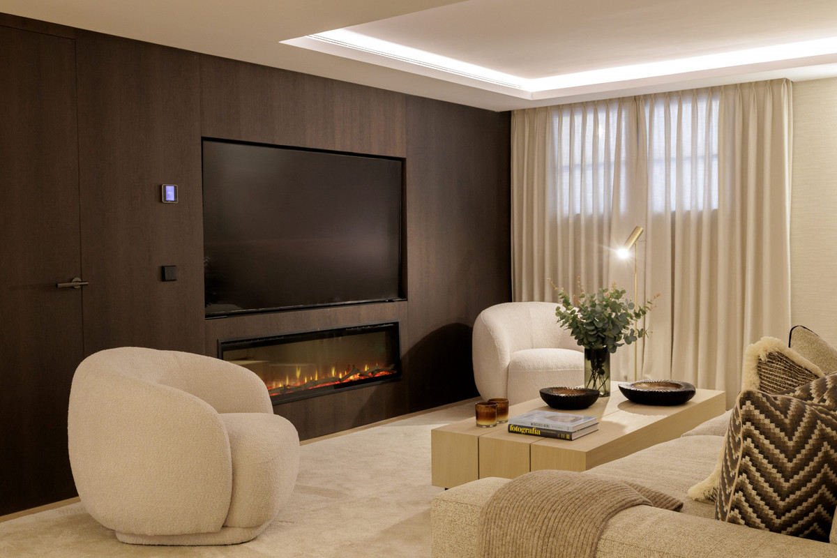 The kitchen is a key highlight of the property. Designed with clean lines and premium materials, it includes a large central island, built-in appliances, and abundant storage concealed within tailored cabinetry. The layout encourages interaction, with direct views toward the living room and seamless access to the exterior terraces and pool. This combination of layout and design makes the main floor one of the home’s strongest assets.