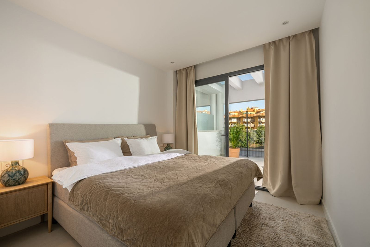 Luxurious west-facing garden apartment situated in the prestigious Higuerón West urbanization, features two bedrooms, two bathrooms, a generous living-dining area, and an open-plan kitchen that is fully furnished and equipped with Bosch electrical appliances. It also includes a laundry area with a washer/dryer.