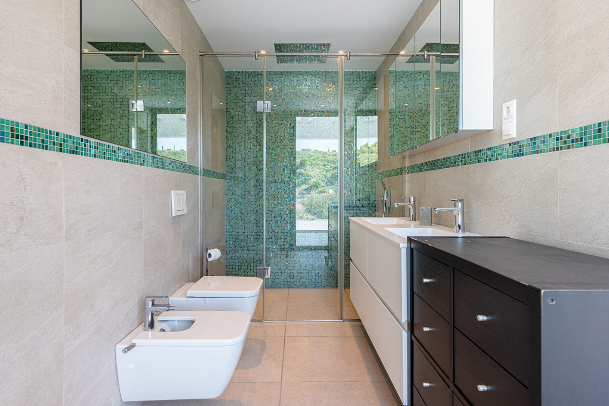 On the entrance level, you will find 4 spacious bedrooms, all offering wonderful views of the surrounding landscape. Three of the bedrooms have direct access to the terrace, and there are 3 elegant bathrooms with underfloor heating, one of which is shared between two bedrooms. This level also includes a practical utility room with laundry facilities and access to the parking area, as well as a convenient lift connecting to the upper floor.