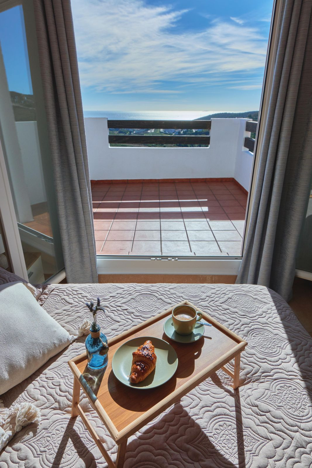 This comfortable apartment with a private terrace and storage room at its entrance, offers two bedrooms, one of which has an en-suite bathroom and its private terrace and a further bedroom with a family bathroom. Fully fitted open plan kitchen, bright and airy living/dining area leading onto an additional private terrace area boasting stunning direct views towards the Mediterranean sea.