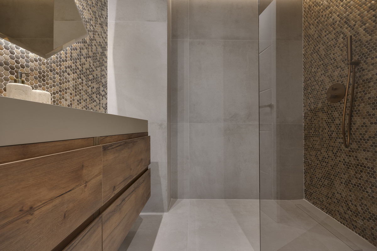 The apartment provides a total built area of 186 m², including 133 m² of interior living space and a 37 m² terrace that extends the principal rooms outward. The layout centres on an open-plan living and kitchen area, designed to promote flow between daily living and social gatherings. Clean architectural lines, recessed ceiling lighting, and neutral materials create a cohesive and modern interior expression. The kitchen integrates seamlessly with the dining and lounge areas, forming a functional core of the home. Three bedrooms are well proportioned, with two en-suite bathrooms and an additional guest toilet. Each bathroom is finished with contemporary fittings, combining practicality with understated design.
