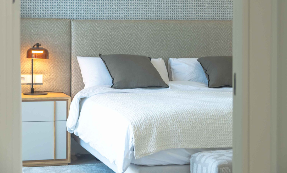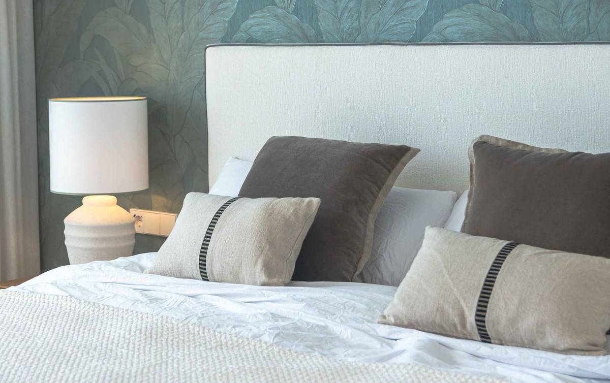 The main living area is arranged as an open-plan environment, where the lounge, dining space and fully fitted kitchen are visually and functionally connected. Large sliding doors extend the interior towards the terrace, reinforcing the relationship between indoor and outdoor areas. The kitchen is designed with integrated appliances and a central island, supporting both everyday use and hosting. Subtle ceiling detailing and material continuity contribute to a calm and cohesive spatial flow.
