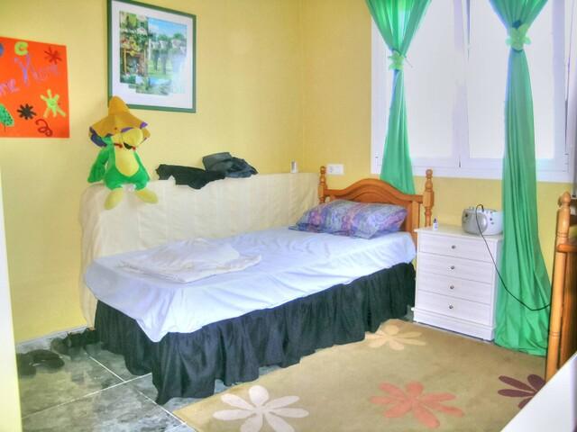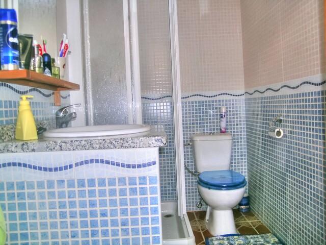 The property features a cosy front terrace leading into a bright living room with three decorative arches connecting to the dining room, which is fitted with a fireplace. It also features a study area with internet and telephone connections, as well as a lounge with satellite TV. The kitchen is fully equipped and opens onto a covered patio with ample storage space. On this floor there is also a bathroom with a shower and a practical storage room.