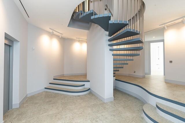 The upper level, accessible via a striking spiral staircase or lift, opens into a stunning open-plan living space with a designer Gaggenau kitchen. Floor-to-ceiling doors lead out to a spectacular “floating” terrace featuring a heated saltwater pool and outdoor kitchen - ideal for entertaining. This level also hosts the luxurious master suite, complete with a walk-in wardrobe, spa-style bathroom, and breathtaking south-west facing views towards Marbella.