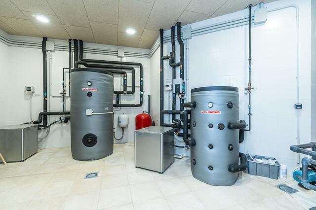 Additional features include underfloor heating, polished concrete floors, 34 solar panels, electric blinds, a jacuzzi, infrared sauna, pellet fireplace, and a water softening system, all designed to provide maximum comfort and efficiency.