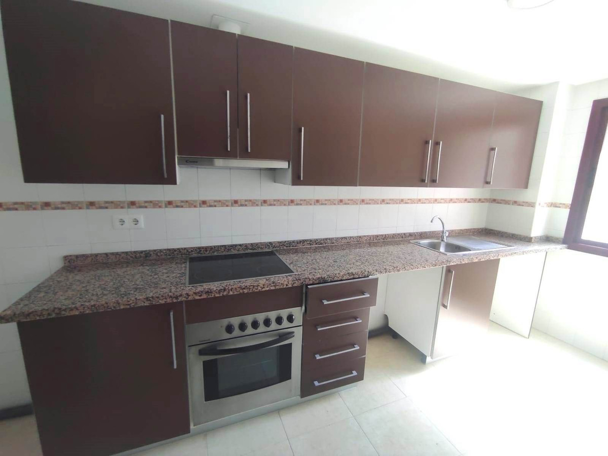 The kitchen is furnished with upper and lower cabinets and includes a ceramic hob, oven, and extractor hood. The apartment also includes built-in wardrobes, a parking space, and access to comprehensive communal areas with a swimming pool and gardens.