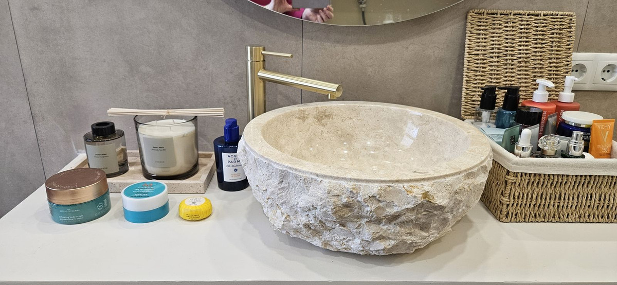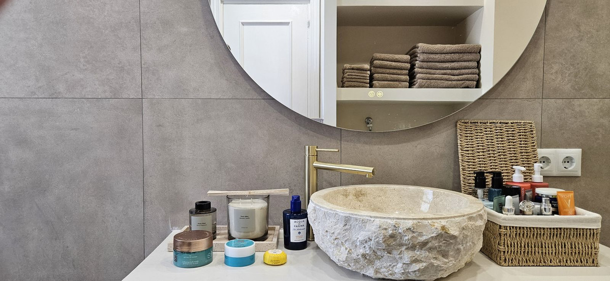 The entrance level welcomes you into a refined open-plan living space, where a newly renovated kitchen flows seamlessly into the lounge. The interior is thoughtfully curated in a sophisticated bohemian style, featuring brand-new, carefully selected furnishings—all unused—creating a fresh and inviting atmosphere. Large openings lead directly onto a charming terrace, where views of the manicured gardens are complemented by partial sea views—an ideal setting for relaxed outdoor living. A tastefully updated guest toilet completes this level.