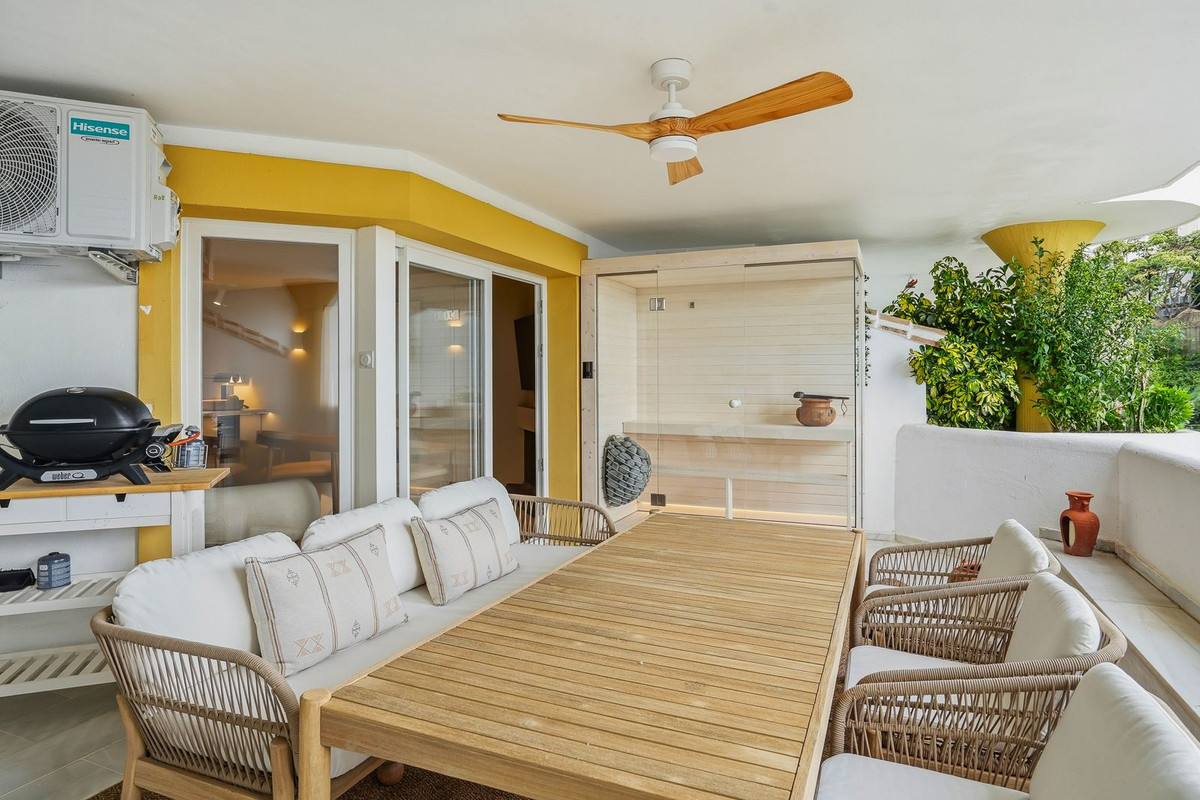 This exceptional 3-bedroom, 2-bathroom luxury apartment is located in the highly sought-after Calahonda Golf community, set in the heart of a picturesque 9-hole golf course. Recently refurbished to the highest standards, the property showcases a sophisticated Japandi design, blending clean Scandinavian lines with warm Japanese minimalism. With a south-facing orientation, the apartment enjoys plenty natural light and beautiful sea and golf views. The spacious terrace is a true highlight, featuring a private sauna—perfect for year-round relaxation and wellness. The property is ideally positioned within walking distance to the beach (15 minutes) and shops, restaurants, and amenities (10 minutes), offering both tranquility and convenience. Set within a secure gated community, residents benefit from communal parking and access to three stunning swimming pools, all surrounded by perfectly landscaped gardens.