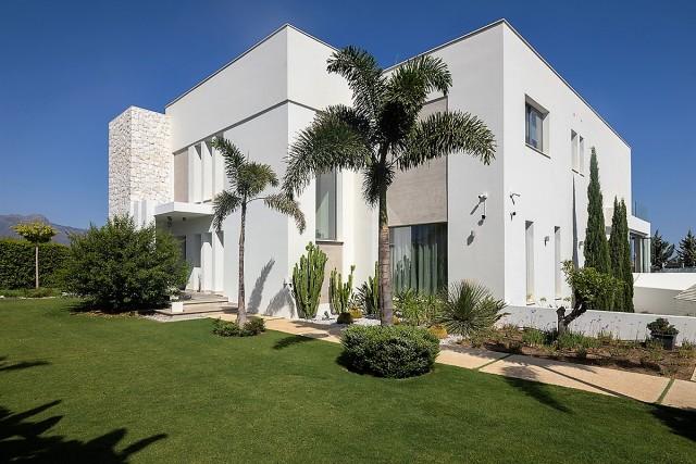 Contemporary style villa with panoramic views in Benahavis. This contemporary villa in a secure urbanization offers stunning panoramic views of the sea, golf courses, mountains, and coastline, including the Straits of Gibraltar, the African coastline, and the Sierra Blanca mountains. Built to the latest EU standards, it features high-quality German construction and eco-friendly technology.
