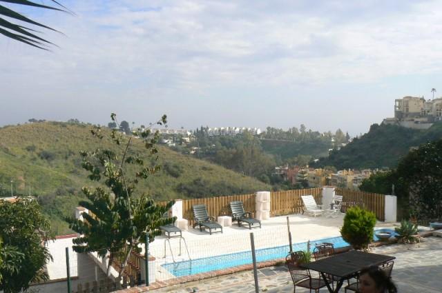 Villa in residential area just 3 km from Fuengirola and beaches. There are great views towards the sea, countryside and mountains. The villa has two levels - the ground floor is not registered as housing - the s top floor is the master bedroom with fitted wardrobes and en-suite, lounge / dining room has access to a great terrace with open views, there fireplace in the living actualemte oil but easily convertible. The kitchen is half open and modern. Downstairs are the other bedrooms, living room, two bathrooms and a kitchenette. There is direct access to the large terraces surrounding the villa also the fabulous pool. It has built a small log cabin with kitchen and bathroom (unregistered). Big potential!