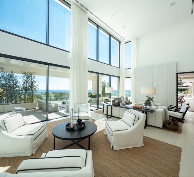 The villa boasts outstanding luxury features including: high ceilings, floor-to-ceiling windows, expansive terraces, infinity swimming pool, outdoor kitchen and epic sunset and sea views. The villa welcomes you into an impressive entrance hall, leading to a spacious and light-filled living room. The villa offers an open-plan layout, where the living room, dining area and kitchen are connected.