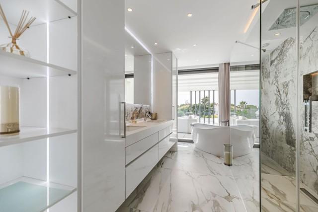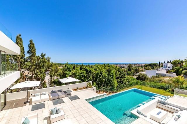 New ultracontemporary villa for sale with panoramic sea views in a prime location in Benahavis. Located on the New Golden Mile, close to the golf courses, restaurants, schools and beaches. The famous Puerto Banus and Marbella Center are just minutes drive. This impressive masterpiece offers both privacy and undisturbed stunning panoramic views to the sea from all floors, even from the basement.