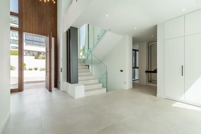 A dynamic contemporary-style design with geometric shapes, open plan concept and striking modern lines, all luxurious features that you can expect from the high-end property. With its perfect blend of beauty, style and functionality, this property is truly unlike any other. Set on a plot of generous size (1920 m2) the house of 750 m2 living area offers 6 bedrooms plus a separate staff-apartment or home office. All bedrooms are equipped with walk-in wardrobe and modern bathrooms en suite with to the highest standard (V&B, Grohe rainshowers). The entrance hall with double-height ceiling of 7 meters height entrance is amazing and gives you already a view to Gibraltar and North Africa.