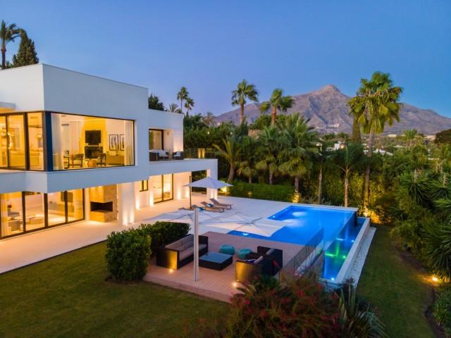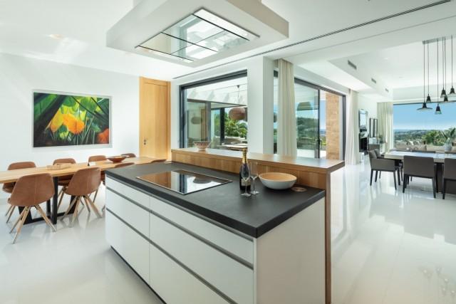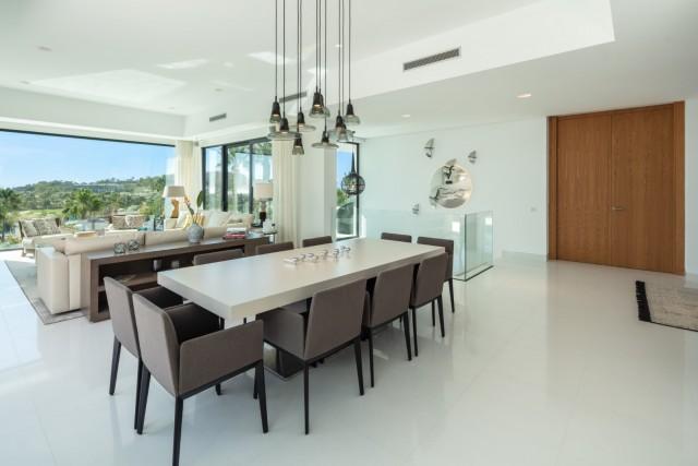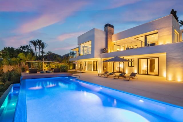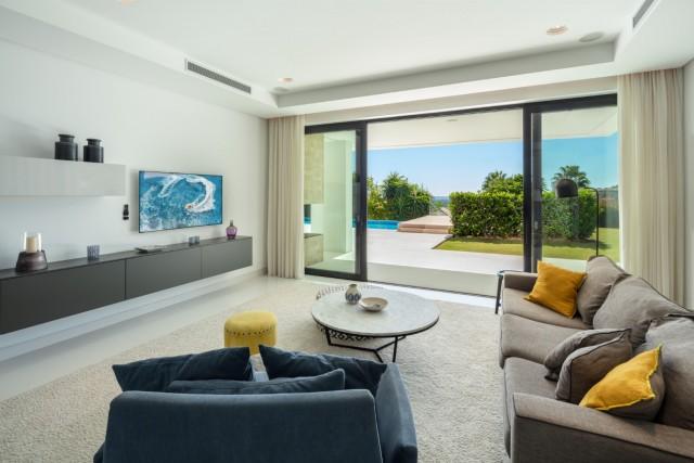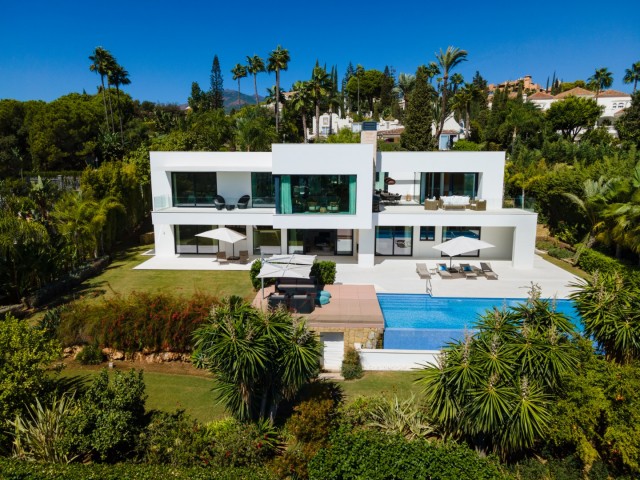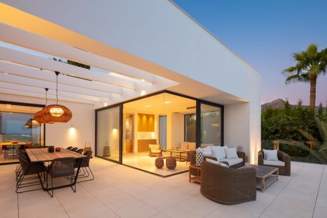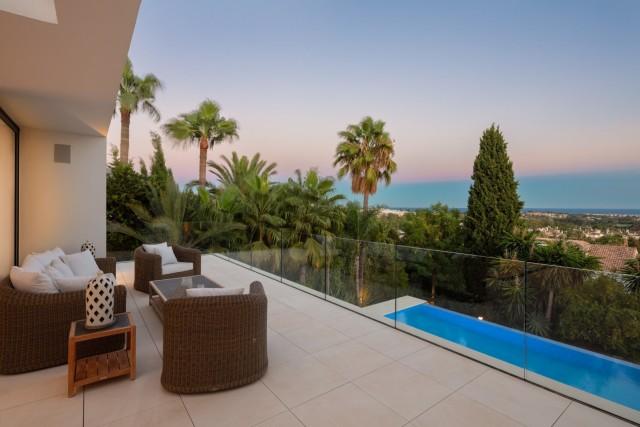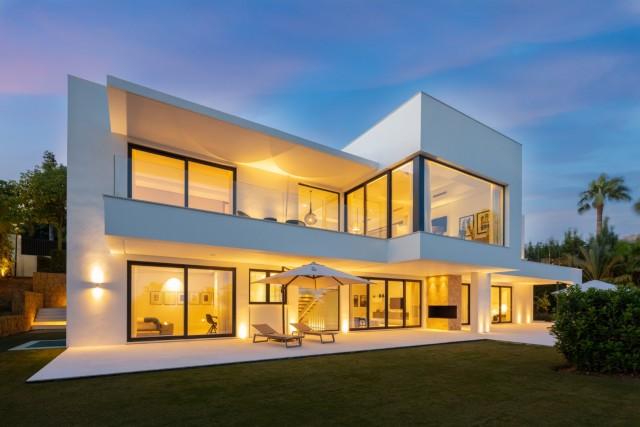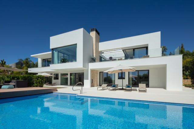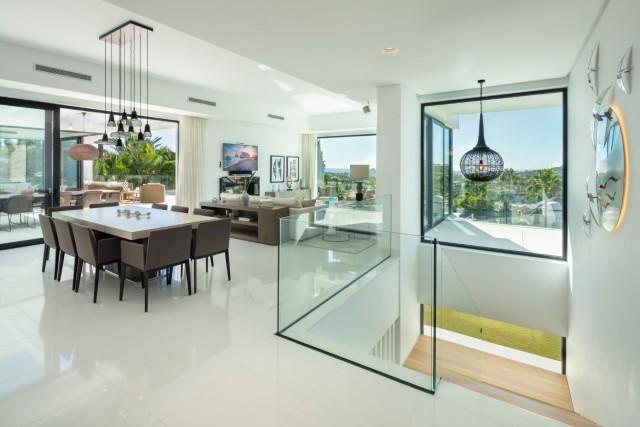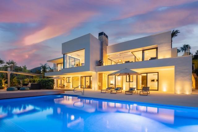 Beautiful Contemporary Villa for sale in Nueva Andalucia. Situated in the prestigious neighbourhood, nestled between three world-class golf courses, this contemporary masterpiece captures sweeping golf to sea views, and has been designed with high quality materials and finishes. A sophisticated entertainer's retreat, this 5-bedroom estate seamlessly integrates indoor and outdoor living while showcasing masterful and modern details. Floor-to-ceiling glass walls surround the living areas highlighting the property’s main attraction - breathtaking views of the surrounding nature.