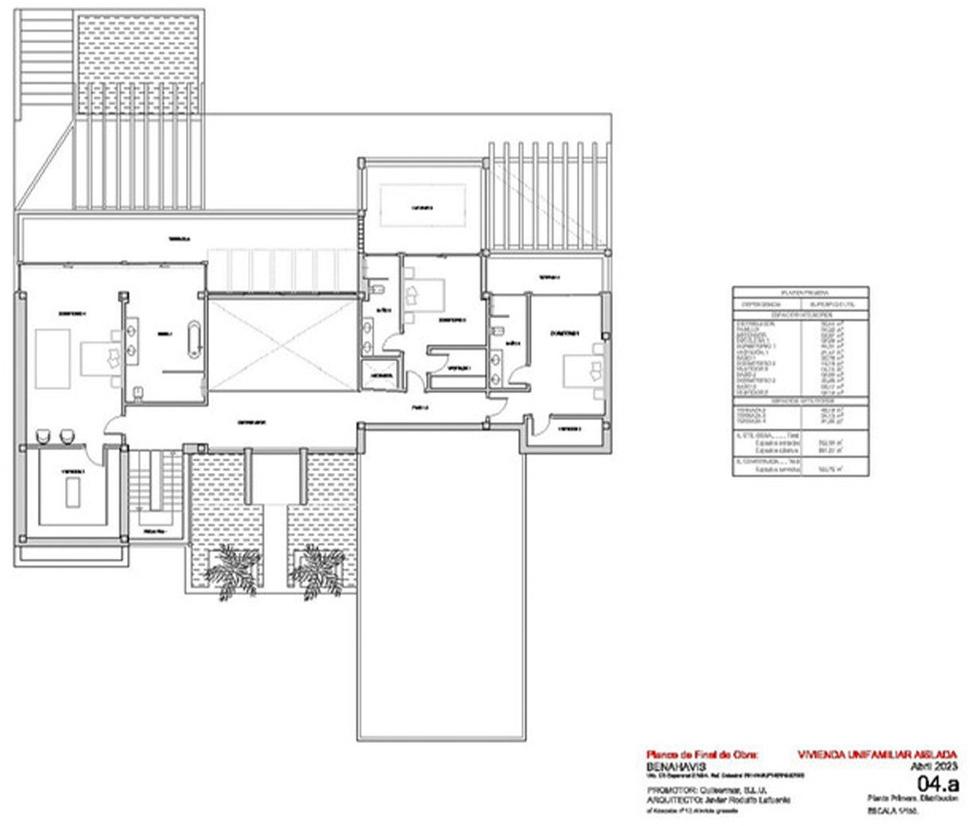 Ascending to the upper level, the main bedroom awaits with an en-suite bathroom, bathtub, shower, walk-in wardrobe, and a private terrace with magnificent views. A walkway overlooking the living room leads to two more en-suite bedrooms with terrace access.